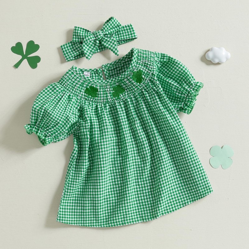 - Feature: Baby St Patricks day outfit toddler girl clothes, round neck bubble short sleeve clover shamrock embroidered ruched plaid print dress, cute baby girl St Patricks Day dress, infant St Patricks Day clothes girl photoshoot outfit