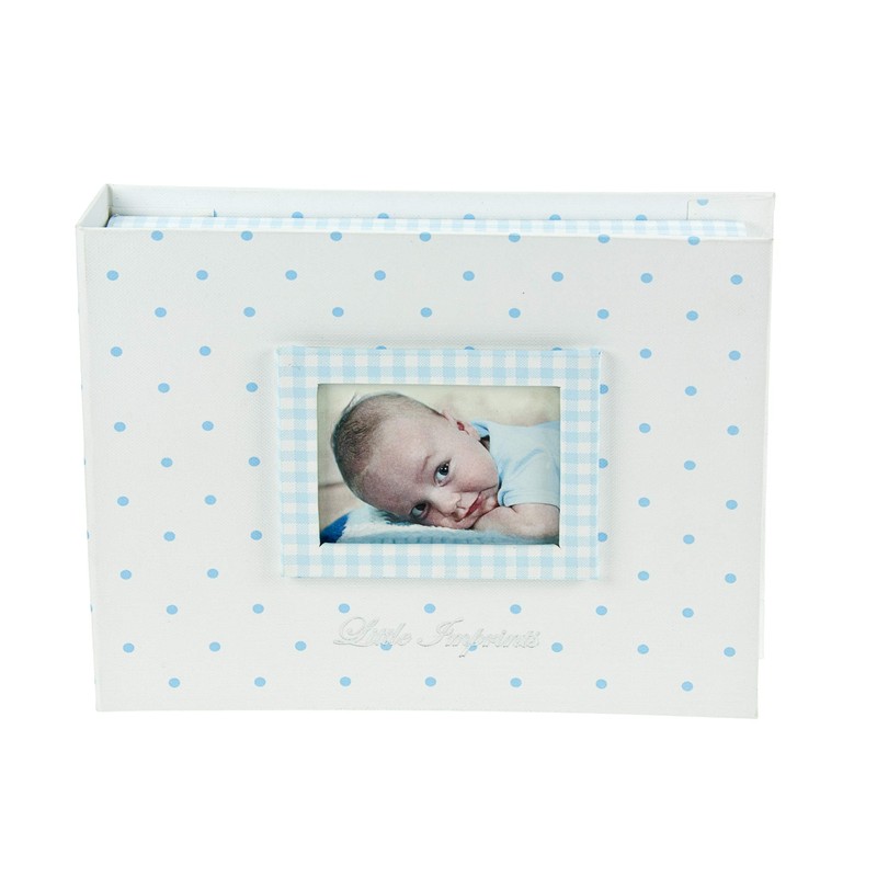 - Lovingly handmade blue polka dot baby gift boy keepsake box and imprint set with photo window on the cover for a baby photo