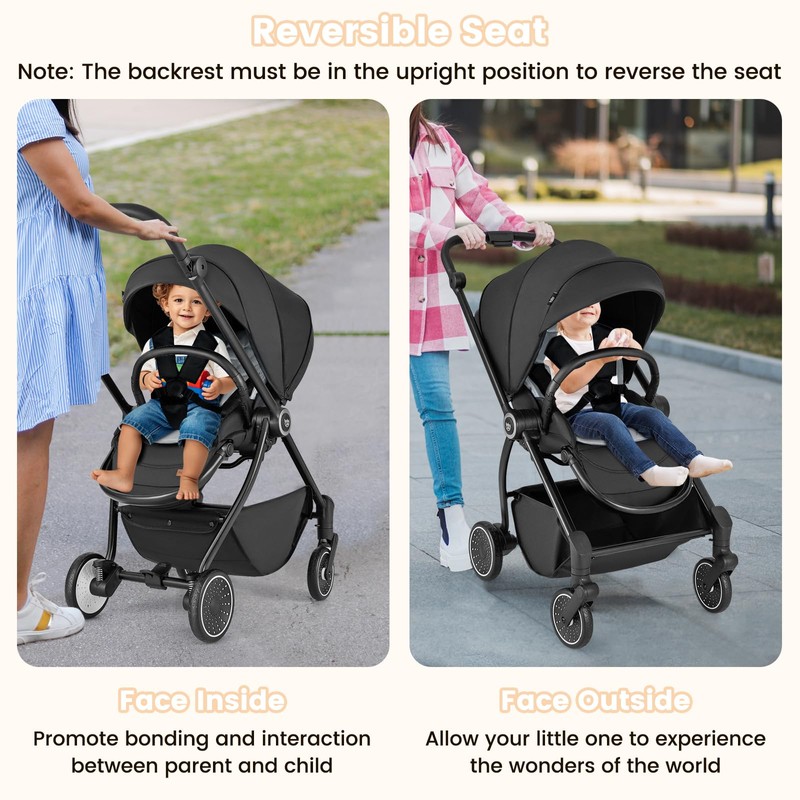 - Reversible Seat: This baby stroller features a reversible seat that allows you to choose the perfect orientation for your little one. Choose to have your child facing you to encourage interaction and bonding, or face the outside world to let them marvel at its wonders. Note: The backrest must be in the upright position to reverse the seat.