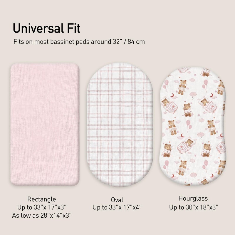- Wide application: GLLQUEN BABY muslin cotton baby fitted sheet cover offers a size of 83 x 43 x 10 cm and a stretchy 100% muslin cotton to ensure versatility, fits oval, rectangular and hourglass mattresses. Fits most mattress toppers in moses baskets, changing baskets, moses baskets and extra beds.