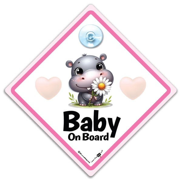 Baby On Board Sign Pink Hippo, Cute Hippo Baby On Board Car Sign, Hippopotamus Baby On Board Sign, Grandchild On Board Sign, Baby Car Sign 14 cm x 14cm