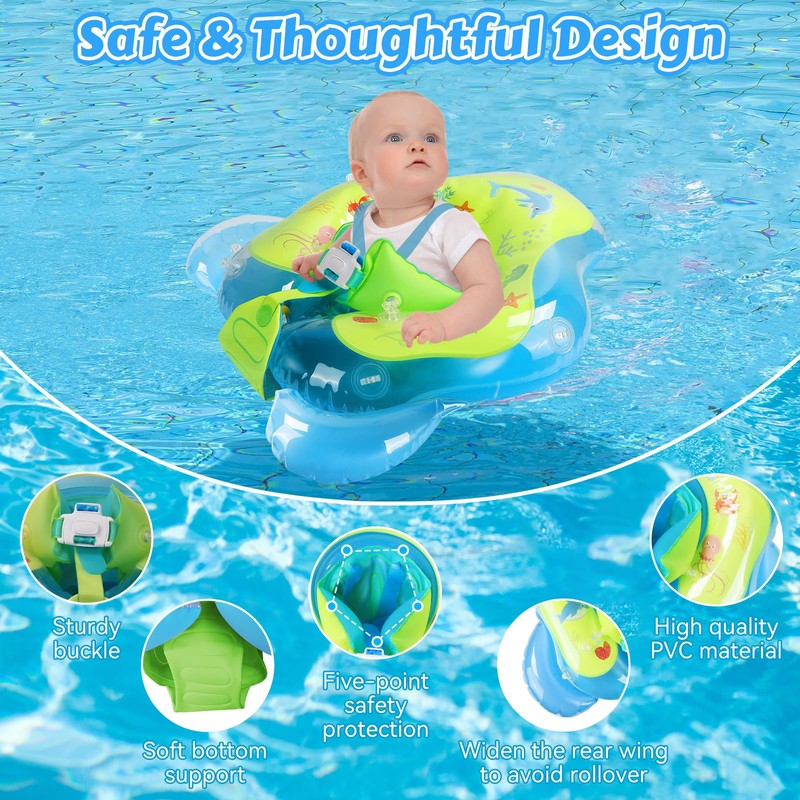 - 【All-round Safety Protection】Baby swimming floats incorporates six scientific protection concepts: 1. Dual airbags explosion-proof design; 2. Cushioned raised design to support baby's head; 3. Both sides of the wider tail anti-turning; 4. 5-point safety belt; 5. Abdominal support ring; 6. The bottom of the reinforcing band; The 6 scientific designs form a three-dimensional protective structure to ensure that the baby always maintains a standard and safe swimming position.