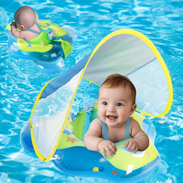 - 【UPF50+ Removable Sunshade】The baby float is equipped with a removable breathable sunshade, UPF50+ professional grade sunscreen, effectively block ultraviolet rays, so that the baby enjoys cool protection when playing in the water outdoors, and mom no longer needs to worry about her baby's delicate skin being attacked by the scorching sun.