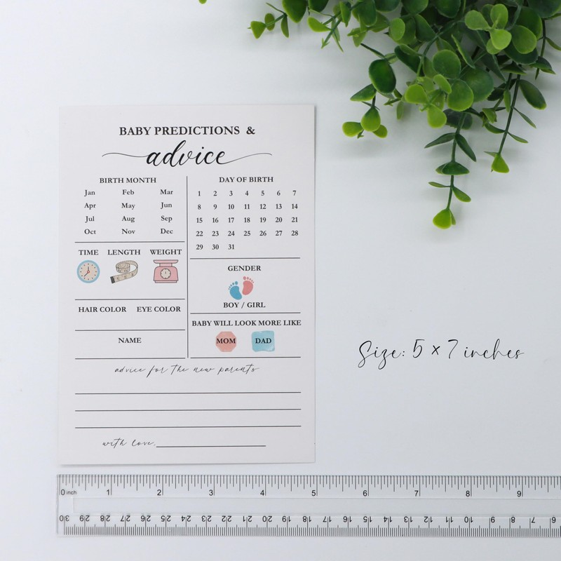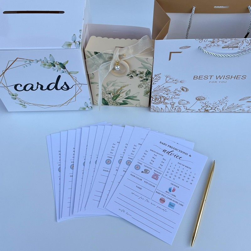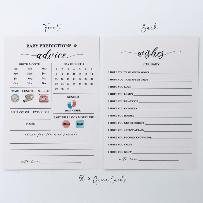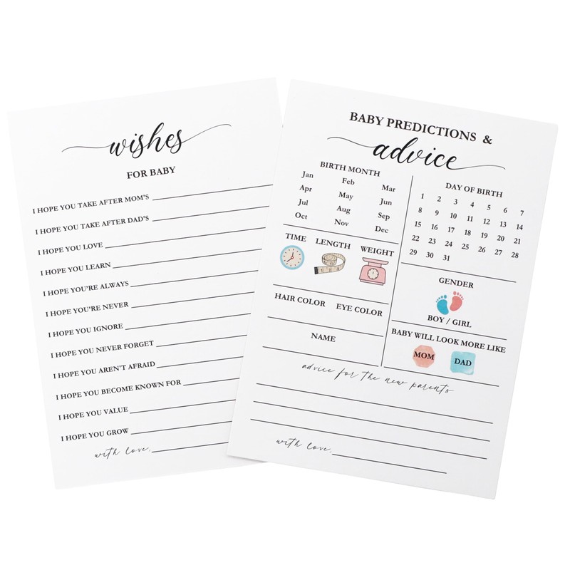 - Dual-Sided Baby Prediction Cards: Each card features "Baby Prediction & Advice" on one side and "Wishes for Baby" on the other, allowing guests to share their hopes and well-wishes for the new arrival. Involve the guests in the excitement of the upcoming arrival.