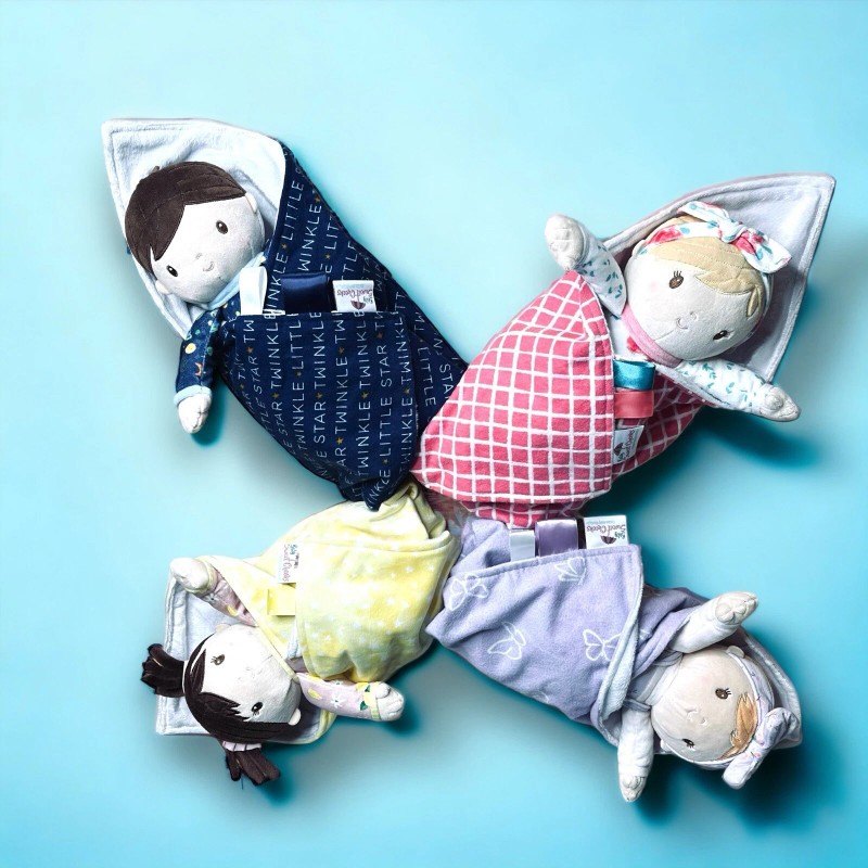 The contrasting snuggly lovie adds double the calmness, cuddles and early imaginative play available for your child. These dolls and lovies are perfect for ages birth & up!