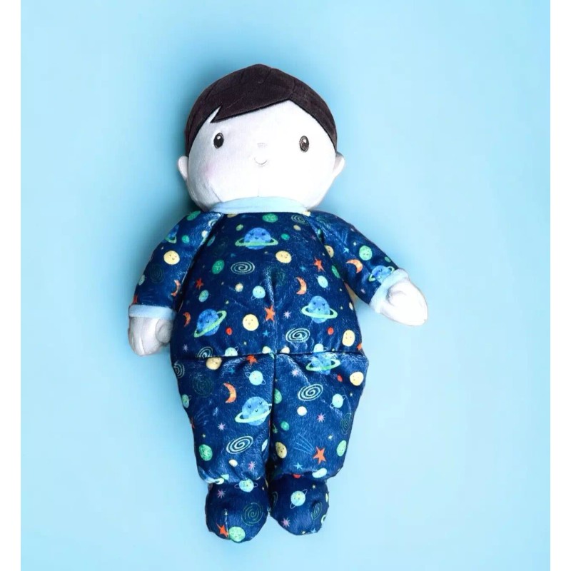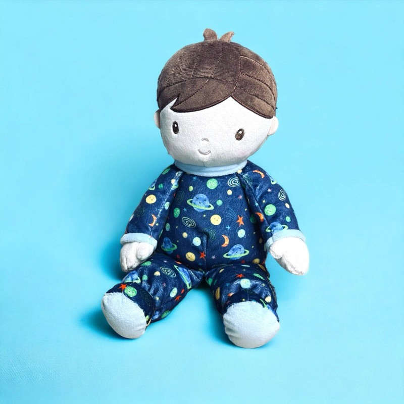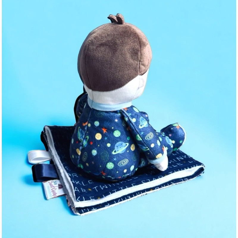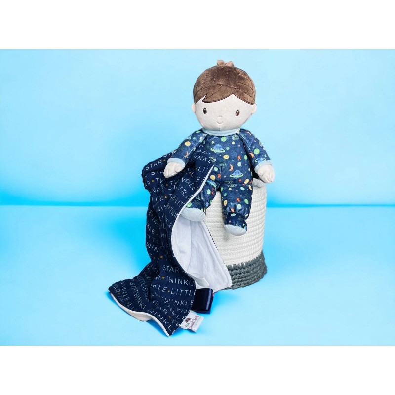 This sweet 13" plush doll is bundled together with a baby lovey and will surely bring tons of smiles and cuddles to your little ones day. This bundle makes an awesome baby shower gift, 1st, 2nd, or 3rd birthday present! These plush bodied dolls are covered in incredibly soft fabric, the face is embroidered for your child's safety. Gavins themed space onesie is not removable. He is stuffed with resilient polyester and a small amount of plastic pellets in the dolls bottom to give it a little weight and ease for setting up. This doll is ideal for playtime or naptime! This doll is one of the Douglas Company soft body doll collections and can be customized with the lovey blanket alone or by adding  an embroidered name to the blanket, please feel free to reach out to me and I can make a customer order as follows: