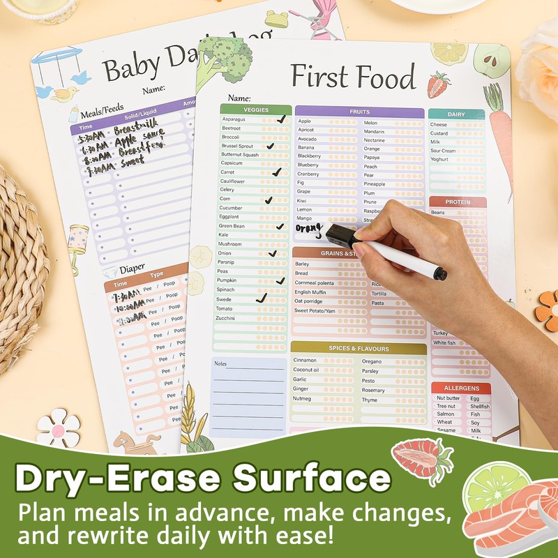 - Package includes: You’ll get 2pcs of baby's first foods tracker and baby daily log fridge magnet. Track your baby’s food journey with our baby food chart. Ideal for recording bad reactions and ensuring a variety of flavors to minimize picky eating. Essential baby food accessories for new parents.