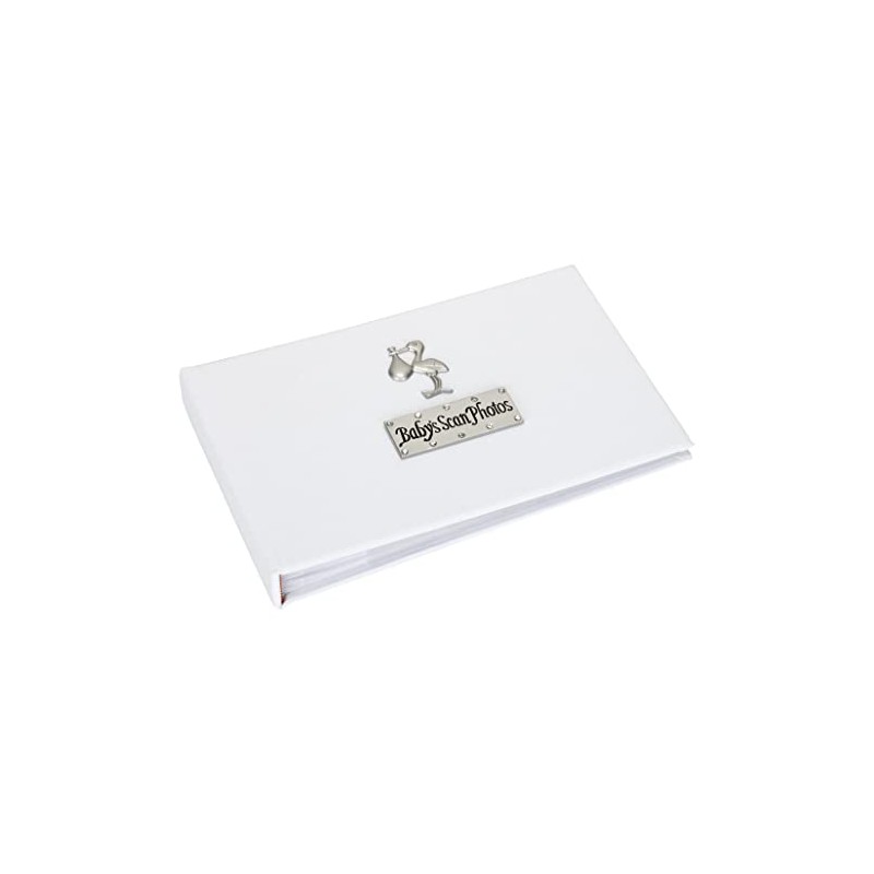 - A stylish white pocket-sized photo album with a double metal design saying 'Baby's Scan Photos' surrounded by tiny crystal stones and with a beautiful sparkly stork.