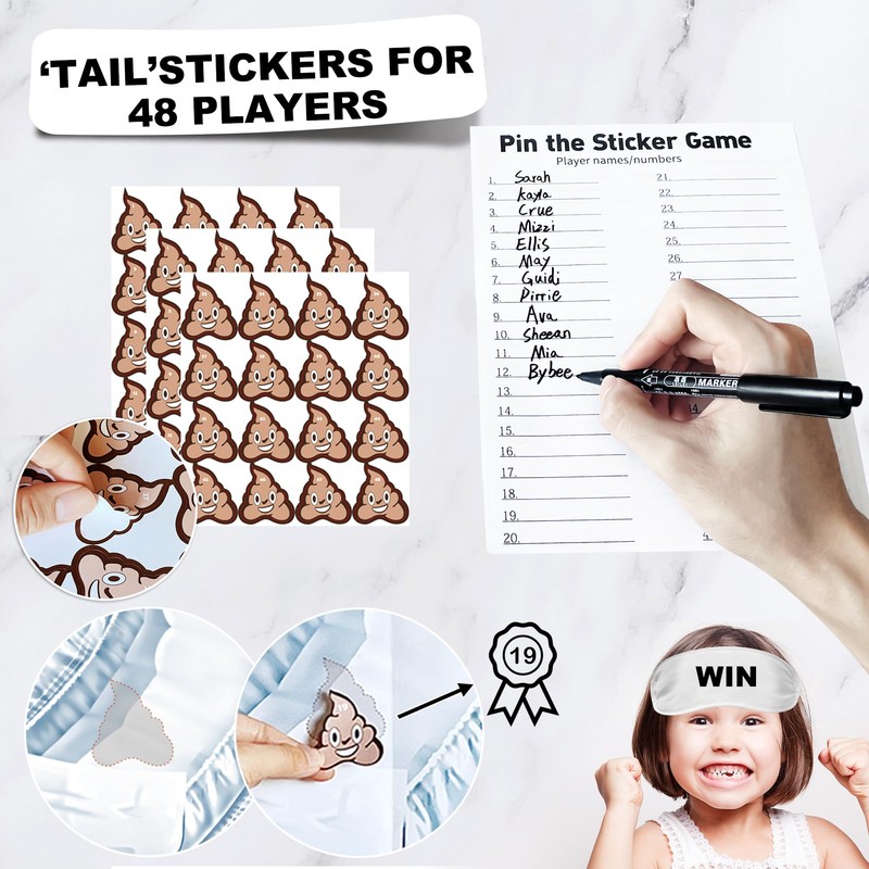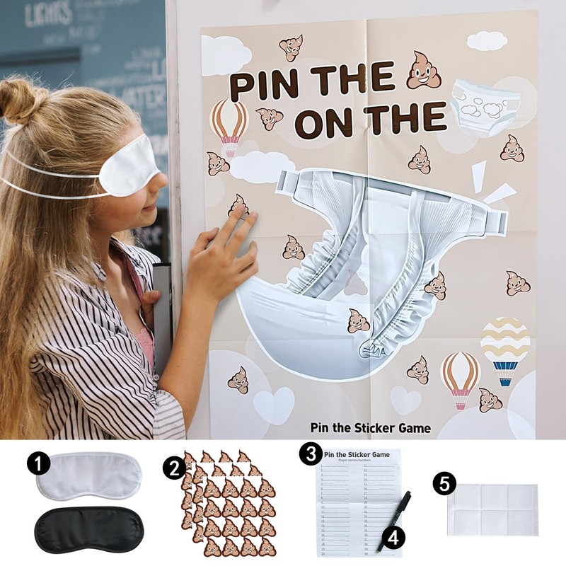 - Baby Shower Games Supplies - Diaper raffle includes 1pcs diaper raffle box for baby shower and 50pcs baby diaper raffle tickets. Pin the sticker on the diaper games includes baby shower poster (16.5 x 20.5 inch), 2pcs blindfolds, ‘poopie’ stickers for 48 guests, 6pcs adhesive tape, record card and pen.