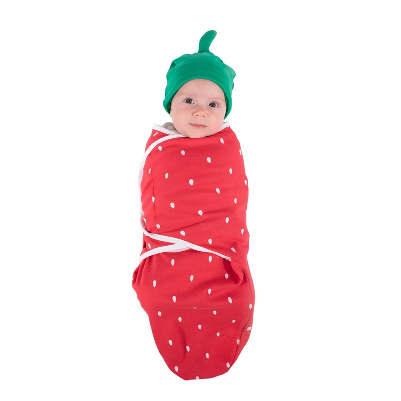Baby Swaddle | 100% Cotton Adjustable Velcro Newborn Blanket Wrap - with Novelty Hat Beanie Strawberry