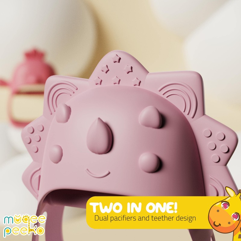 - 2 in 1: Teether and pacifier! Dual pacifiers help your little one self sooth while the textures of the wearable teether massage and stimulate gums, promote oral development, and help relieve painful teething symptoms.