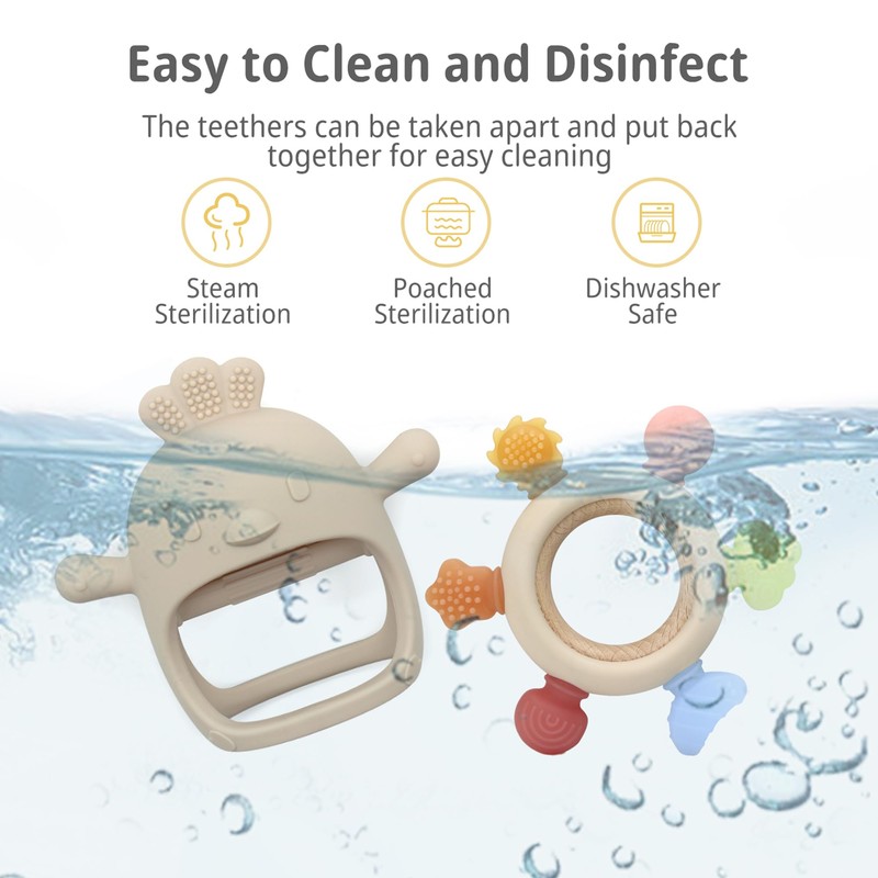 - EASY TO CLEAN: Our baby hand teether resists dust and hair. Sterilize in boiling water, dishwasher, or freezer. Rinse with warm water after use for easy cleaning. Ideal teething toys for babies :)