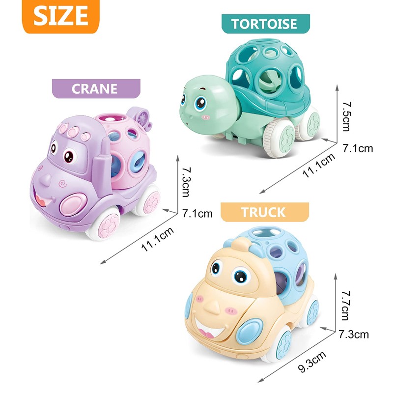 - 3 Different Style: This push car toy set contains 3 types of tortoise, truck and crane. The size of our push go cars are approximately 4" in length, 3'' in height. Made of ABS material, odorless, sturdy and anti-collision and resistance to fall, no sharp edges or corners, let your kids play happily.