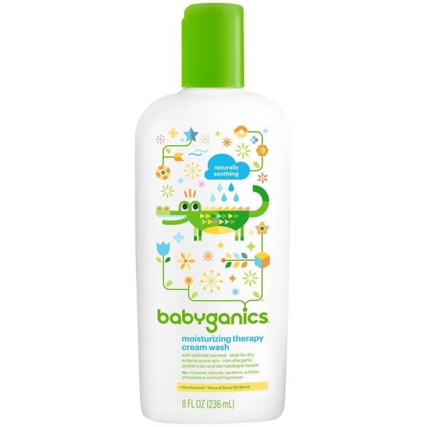 - Babyganics Naturally Soothing Moisturizing Therapy Cream Wash. With colloidal oatmeal, ideal for dry, eczema prone skin, non-allergenic pediatrician and dermatologist tested. No: cortisone, steroids, parabens, sulfates, phthalates or artificial fragrances. +NeoNourish natural seed oil blend.