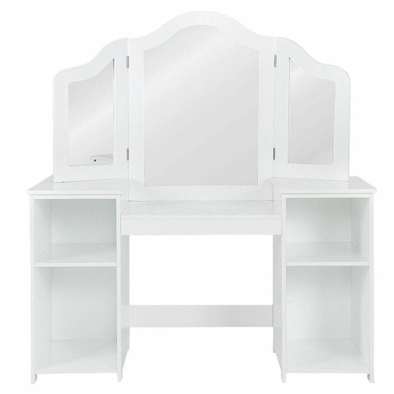 Kids Vanity Table is a multi-functional dressing table tailored for children which gives your kids a funky place and more chance to become beautiful. The child vanity table is suitable for children over three years old. With the three-panel mirrors design of the dresser, your children can find the perfect angle, make up from multiple angles and get a better reflection. There are four storage compartments under the dressing table surface for children to store books, toys and daily necessities. When your kids are using the vanity table, you didn’t need to afraid they would be bumping or scratched because the round corner of the table is designed to reduce potential safety hazards for children. This kind of white vanity table can match the chair of all colors and styles, you can choose chair to use casually. Such a safe and affordable versatile makeup desk can meet your makeup, learning and storage table and storage. What are you waiting for? Come and take it home!