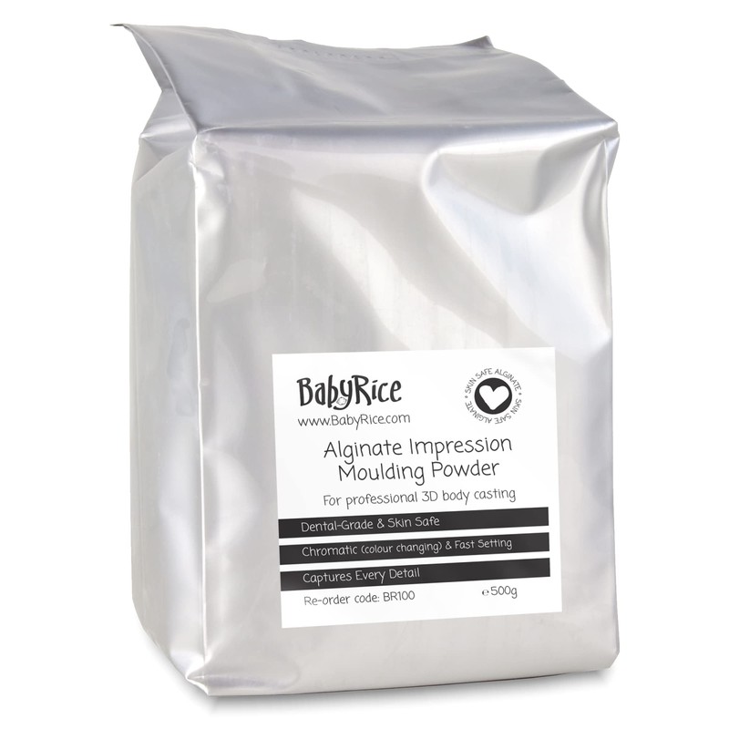 BabyRice Alginate is a high grade colour change 3D mould impression powder - and is totally safe for use on even the newest newborn skin as the alginate's main ingredient is seaweed! It conforms to British safety standards BS 4269 Pt.2:1991 & ISO 1563:1990).