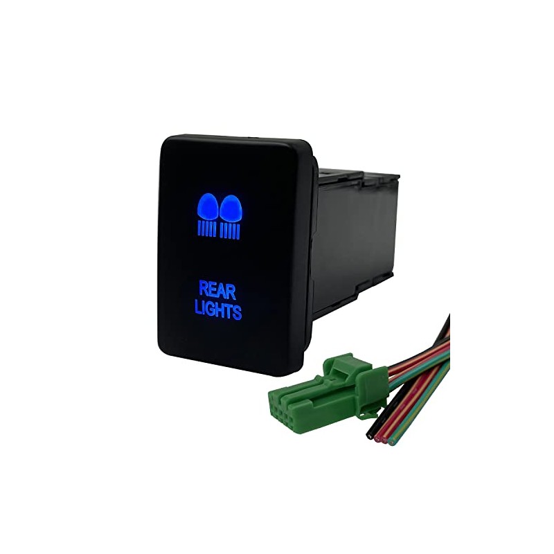 BACAUTOPARTS Blue Led Rear Lights Push Button Switch for Toyota Sequoia Highlander Landcruiser Tacoma 4Runner Highlander 3Amp 12V Illuminated ON-Off SPST Button Switch with Wiring Connector