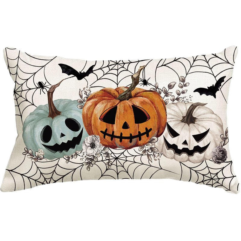 Baccessor Halloween Pillow Cover 12x20 Inch White Pillowcase with Bats Pumpkins Webs for Farmhouse Couch Décor 1pcs