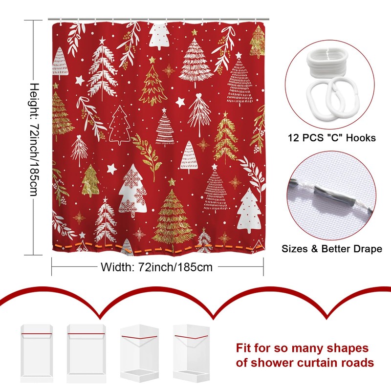 - [Sturdy & Fabric] Christmas Tree shower curtain is made of 100% polyester with unique patterns and odorless, durable, and lightweight material, sturdy but soft feeling. The red christmas tree new year shower curtain is composed of enchanting, delicate flower and leaves. Drapes beautifully for a fresh, new look in your bathroom.