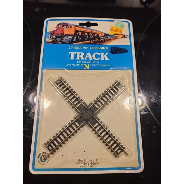 This Bachmann 90 Degree Crossing is perfect for any N-Scale train layout. The black crossing comes in a sealed package and is an unassembled kit made from plastic material. It is compatible with trains and suitable for 17 years and up. The crossing is a vintage item made in the United States by Bachmann.