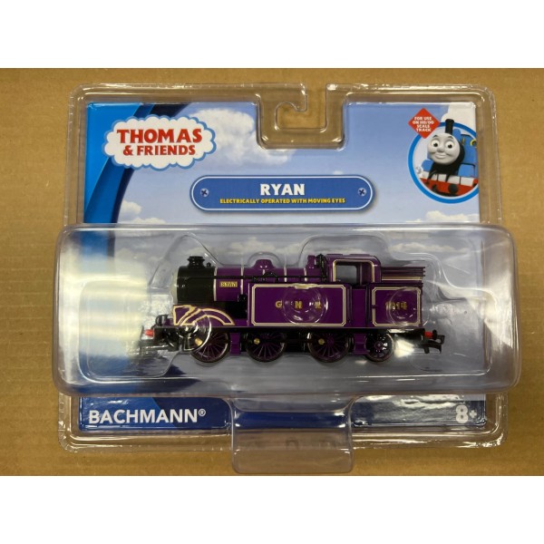 HO Scale Ryan with Moving Eyes. Ryan is a purple tank engine who used to work on the Great Northern Railway. He takes goods on the Harwick Branchline, while Daisy takes passengers. Ryan is based on a GNR Class N2 steam locomotive. Bachmann carefully reproduces your favorite Thomas & Friends™ characters in HO scale. All locomotives feature realistic faces with moving eyes, operating HO scale electric drive mechanisms, highly detailed plastic body shells, all-metal wheels, and international-style hook-and-loop couplers.