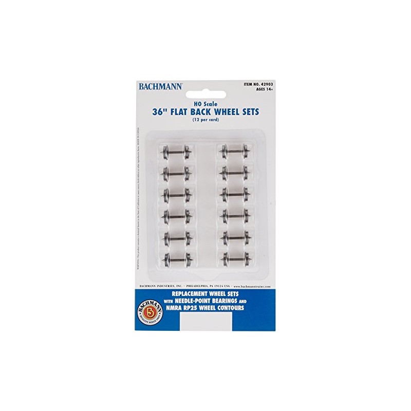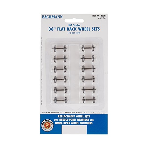 Bachmann Trains 36" FLAT BACK WHEEL SETS (12 per card) - HO Scale. These high performance blackened metal wheels feature a scale profile with needlepoint bearings and RP25 wheel Contours. The perfect replacement allows for smooth operation of your rolling stock.