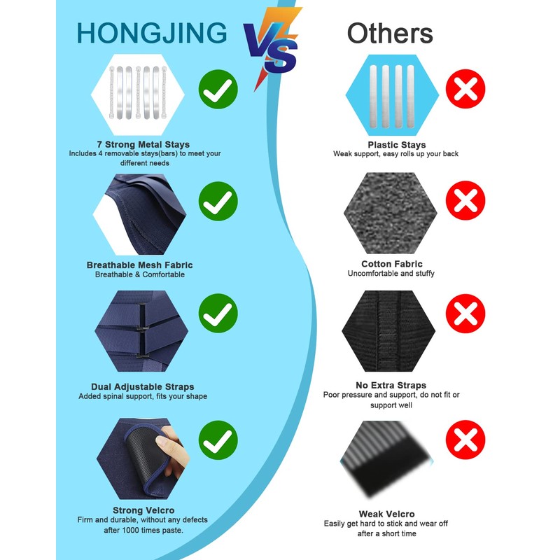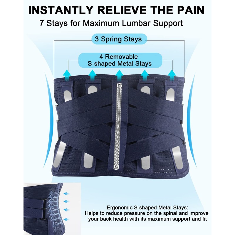 - Lower Back Pain Relief: Thanks to 4 removable metal stays and 3 built-in steel springs, the HONGJING back brace can provide maximum support and compression around your lower back. This back brace can effectively reduce back pressure and relieve herniated discs, sciatica, back pain, scoliosis, sore muscles, and other back problems.