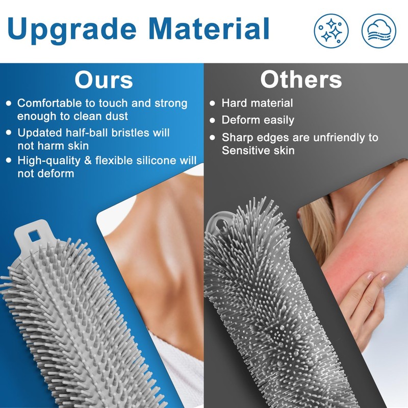 - 【Comfortable High-Quality Material】Made of high-quality silicone, the bristles are stiff and not soft, which effectively removes itch and dust. The half-ball bristles design can clean your back quickly without harming your skin.