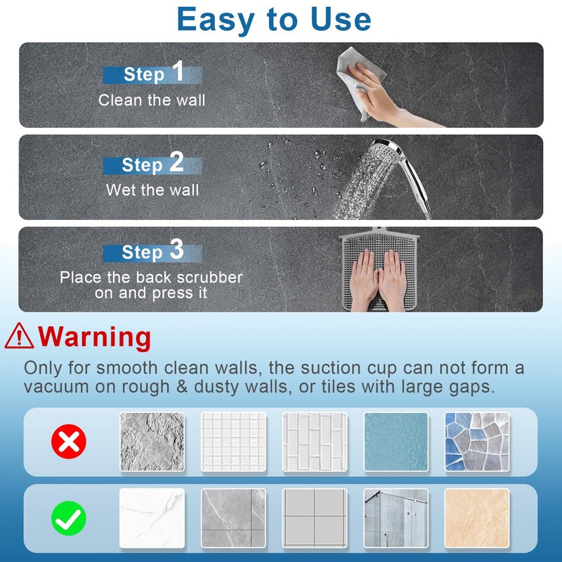 - 【Easy to use】Clean and wet the wall, place the shower back scrubber at the optimal height, press all the suction cups to push out the air inside, then simply rub the back against the back washer to massage and relieve itching while cleaning back.
