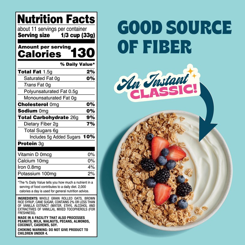 Crunch into wholesome granola made with whole grain rolled oats, lightly sweetened with fruit and cane juices. Classically simple. Simply delicious.