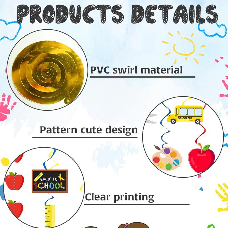 ----These back to school decorations are made of premium PVC swirl material, with clear printing, cute patterns, practical and stable and no fading.