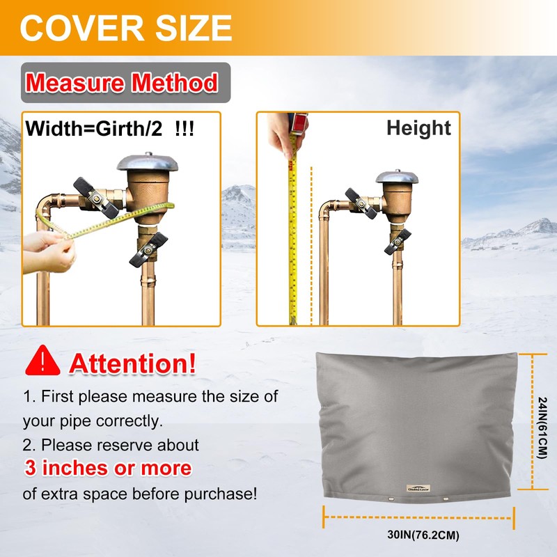 - Cover Size: Our backflow valve cover insulated is 30*24 inches. As what we provide is the outer dimension of the product, and the product itself has a certain thickness. So please measure your pipe size and reserve about 3 inches or more of extra space before purchase