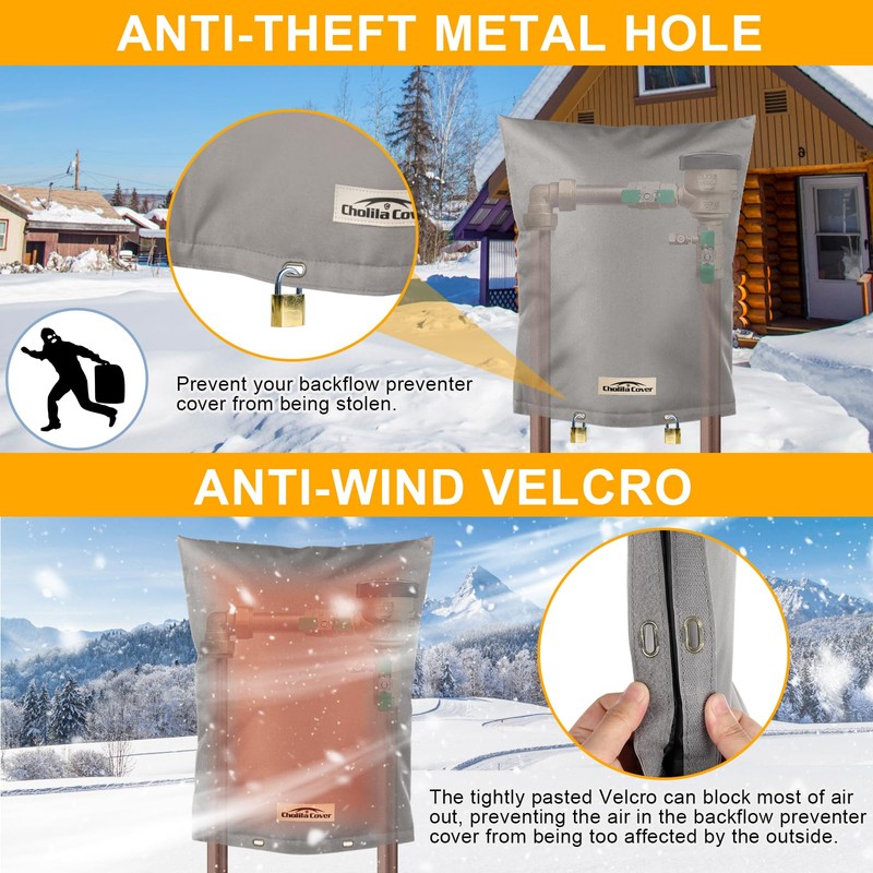 - Anti-wind and Anti-theft: The bottom of the backflow cover is Velcro, which keeps the cover sealed closed to prevent cold wind from entering. There are also two metal loops on the Velcro, you can use our cable ties or use your own chain or small lock to fasten it to prevent it from being easily stolen by others