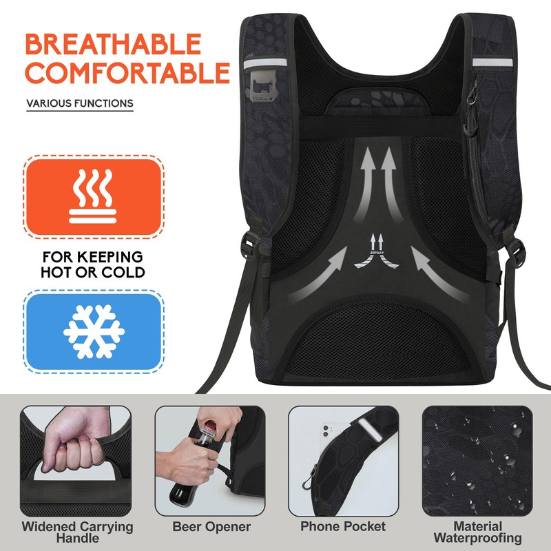 • Waterproof & Leak proof: The materials inside and outside of our insulated backpack are waterproof. The cooler back pack liner adopts high-tech seamless hot pressing process for leak-proof. This means you can confidently fill the cooler bag with ice, beer cans or soda cans. It's the perfect lunch backpack for men women