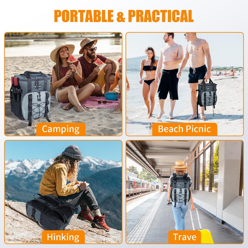 - Ergonomic Design: Our cooler backpack is equipped with a soft and breathable sponge pad to alleviate pressure on your shoulders and back. Additionally, there is a padded handle on the top for easy carrying by hand. Perfect for family beach trips, camping, picnics, hiking, hunting, fishing, boating, self-driving tours, or other outdoor activities.