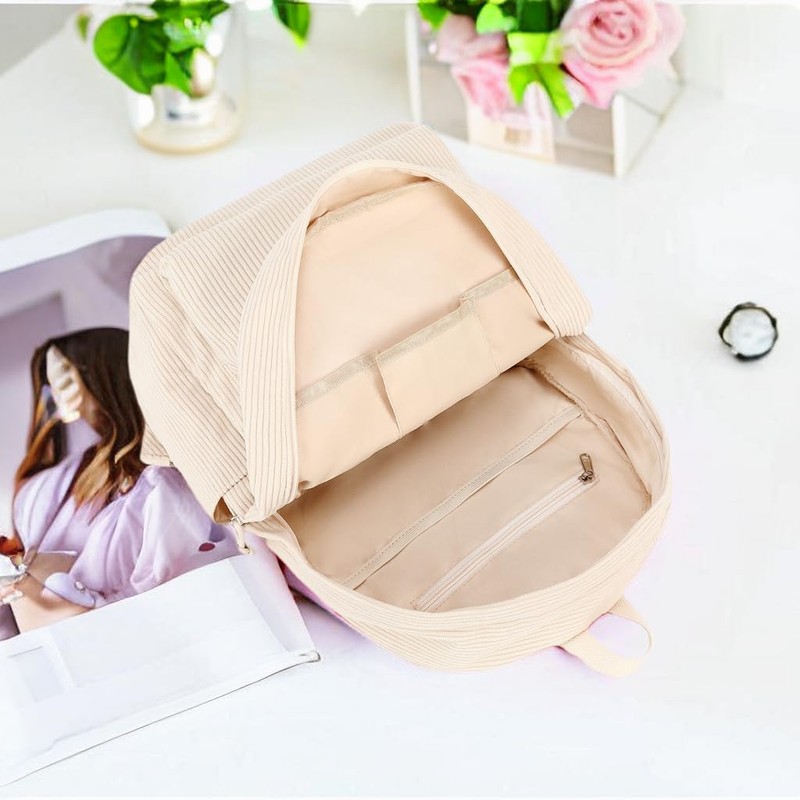 Backpack for Teen Girls Corduroy Bookbags Elementary Middle High School School Bag Lightweight Women Travel Casual Daypacks (2-Beige Set)
