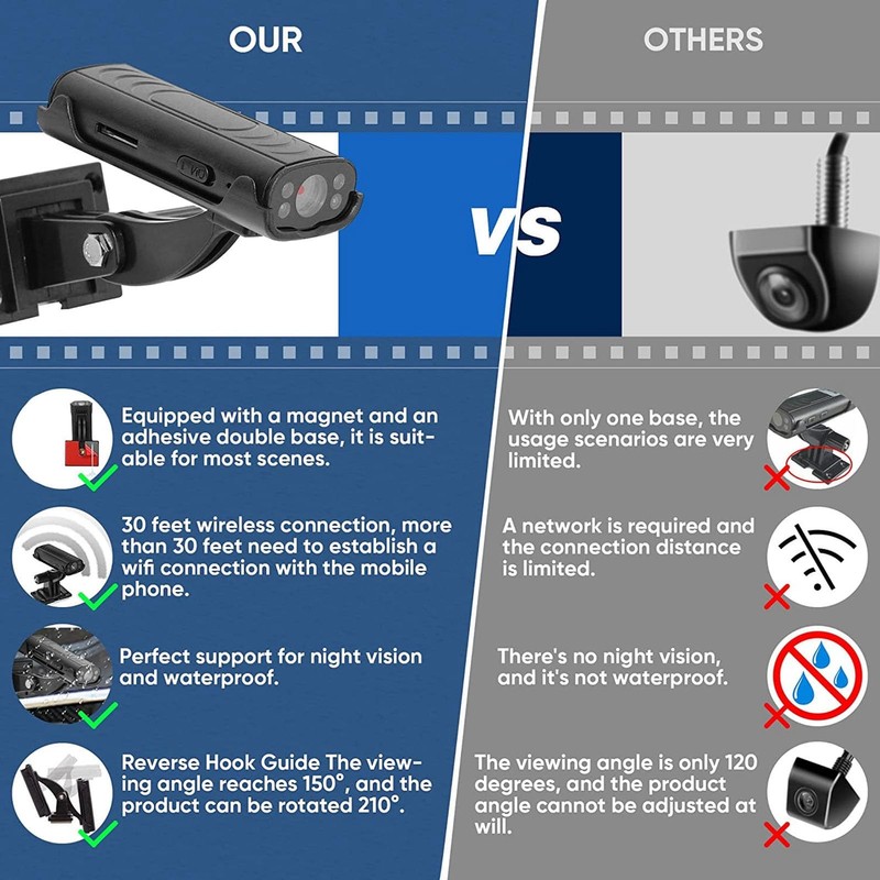 - Flexible Installation: The rearview camera is equipped with adhesive base that can be adjusted from multiple angles, and the built in battery can be easily installed in a variety of environments for managing stores, warehouses, home security, driving recorders, and more.