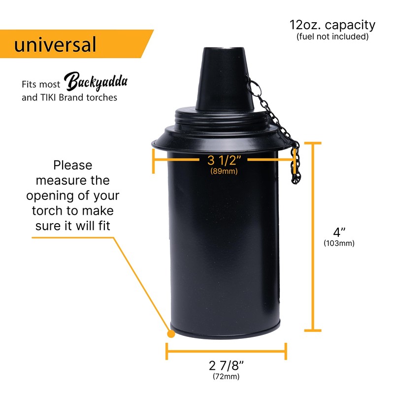 • Wide mouth design makes filling your backyard torch easy, safe, and fast. No spills means no wasted torch fuel. or citronella. A lightweight design ensures no added weight. Compatible with Backyadda and Tiki Brand torches. Snuffer caps included.