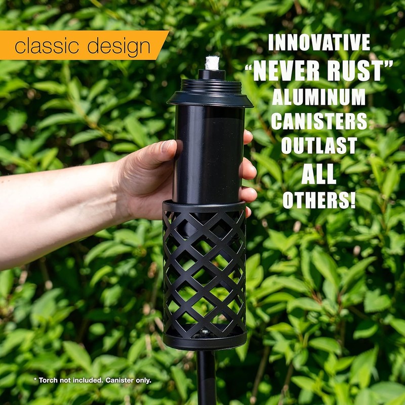 Bring Your Backyard Back To Life. The Backyadda Brand proudly presents our newly designed (12 oz.) aluminum tiki torch replacement canister. Tiki torch canister replacement can now be a thing of the past with these long-lasting aluminum canisters. Our tiki torch cans include fiberglass wicks and snuffer caps (Torch Fuel Not Included). Steel torch canisters are prone to rust, unevenly heat, and provide trouble with screwing/unscrewing the refill lids. These aluminum canisters have been tested and proven to counter the challenges presented with traditional steel canisters. Each refillable fuel canister provides wide mouth opening for easy pouring of any torch fuel. The wide mouth opening provides a pain free torch refill everytime. The tiki replacement canisters by Backyadda are black-coated and do not have any script or stickers on the cans, so open-style torches and weave designs will have a clean, classy look. Give your backyard celebration, patio party, company luau or deck get-together the natural torch ambiance everyone enjoys. Includes 4-12oz. Aluminum Canisters with snuffer caps and 4 fiberglass wicks.