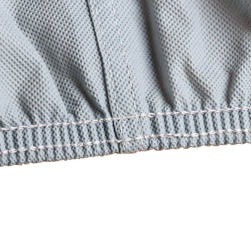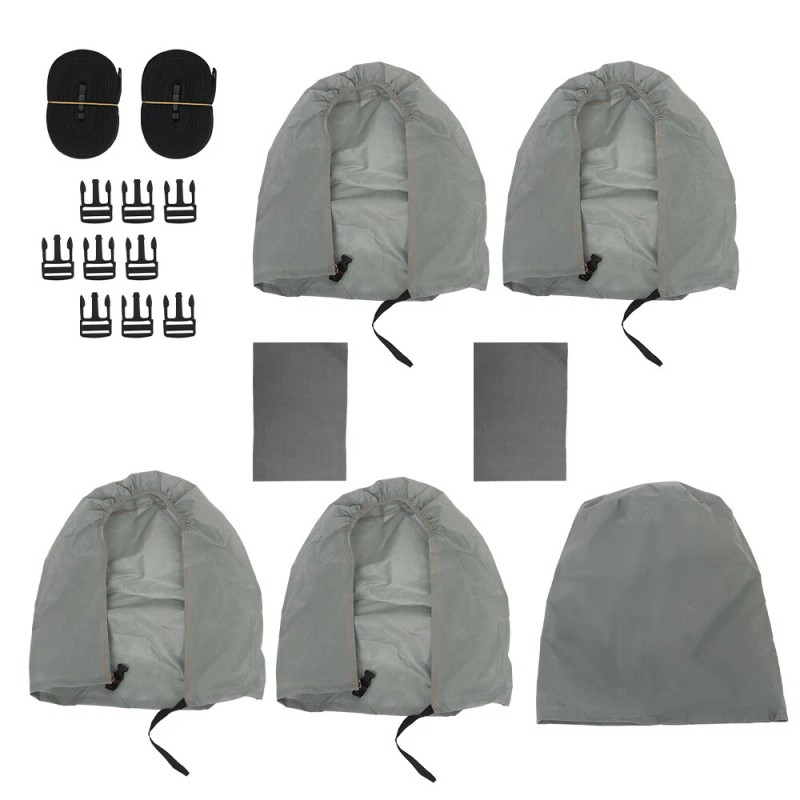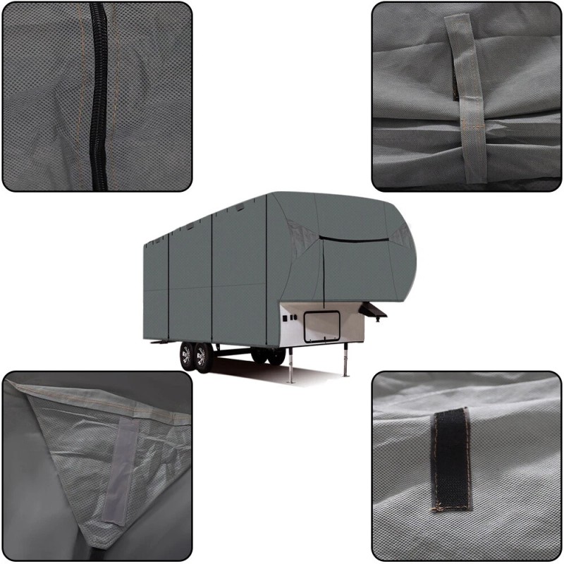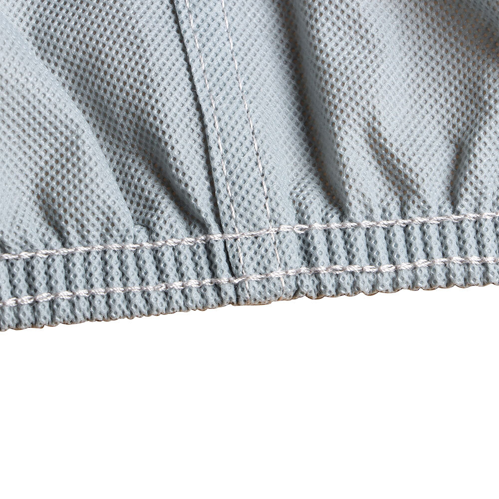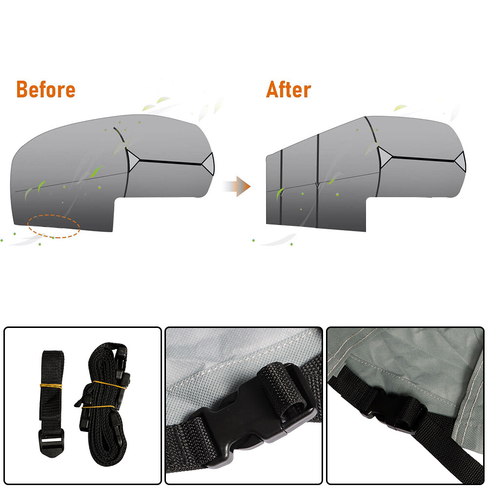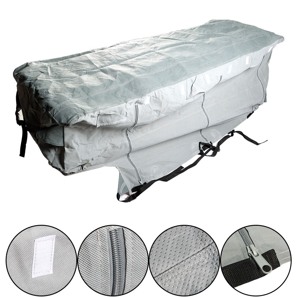 Feature: *Upgraded Thicker 4 Layers top provides All season protection against Sun UV rays, rain and snow while venting inside water vapor and condensation. *Fabric UV Treated for heat and sun protection and Breathable to avoid mildew and mold . *Elastic hems, grommets with integrated undercarriage strap system with multiple click-close straps for a snug fit and security. *Extra long straps to resist the wind better. Inner many waterproof Straps and Buckles at bottom are more anti-aging than the outsides. Adjustable front and rear tension panels and elasticized hem corners provide a custom fit.