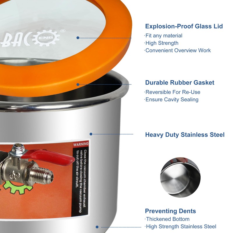 - 1.5GALLON VACUUM CHAMBERStrong and durable stainless steel 8.6"(ID)5.9"(H) degassing chamber with silicone gasket. Silicone gasket to be used over 10,000 times without deterioration. Liquid filled gauge measuring range of vacuum gauge0-30inHg.