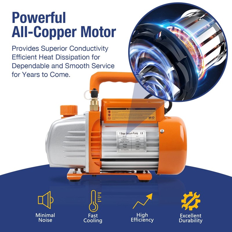- ?? ?????? ????Alloy aluminum casing makes the single-stage rotary vane AC vacuum pump durable and long time use. High volume cooling fan keep the pump running efficiently and for a longer life.