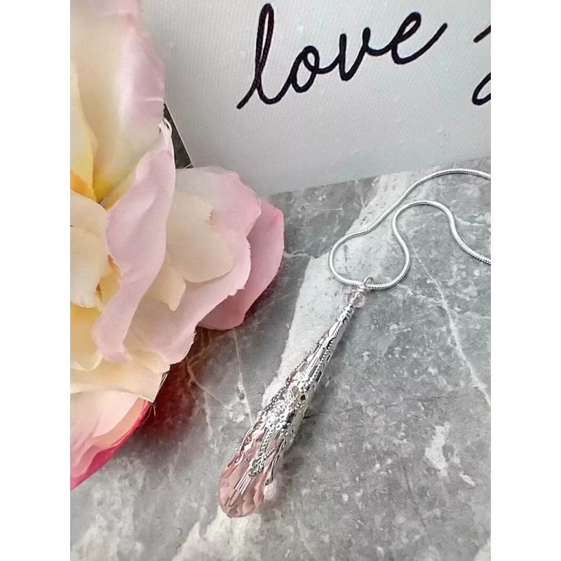 Bad Apple Designs Elegant Pink Crystal Teardrop Pendant Silver Necklace 18"