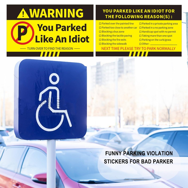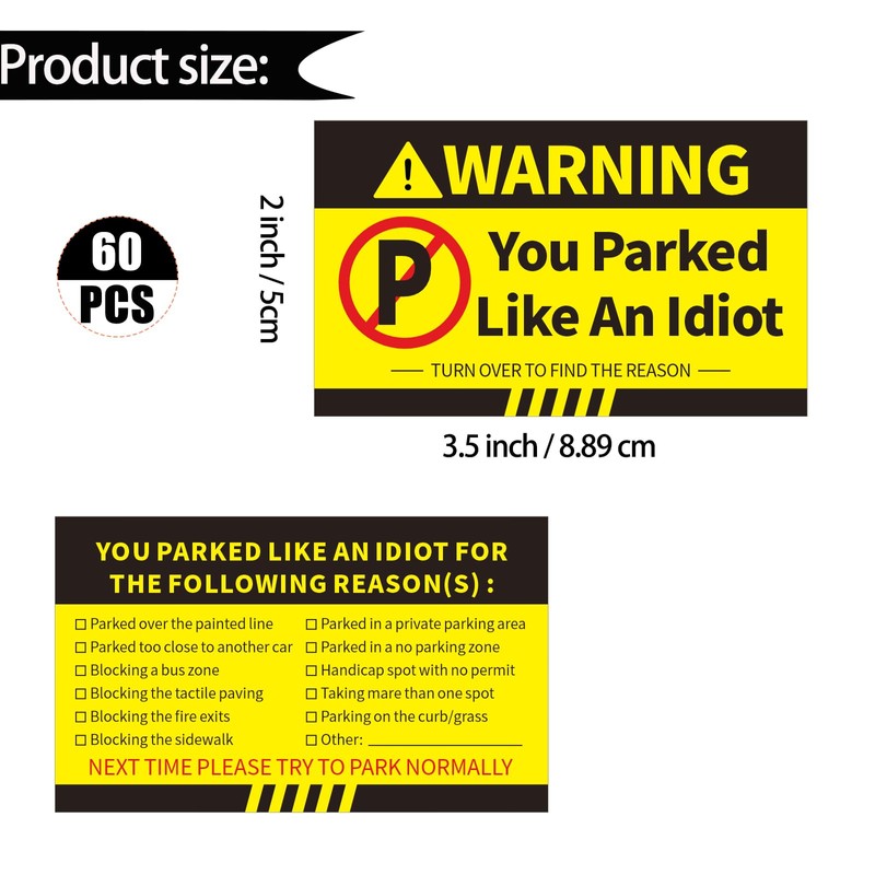 - Eye-Catching design: The bold and eye-catching design of the bad parking cards serves as a clear warning sign to tell the bad parkers they how stupid parking they really are.