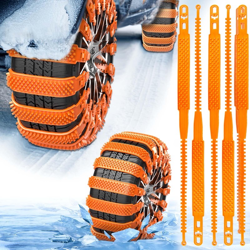 - This snow chain product contains 5 non-slip snow chains cars, the colours are orange and black.