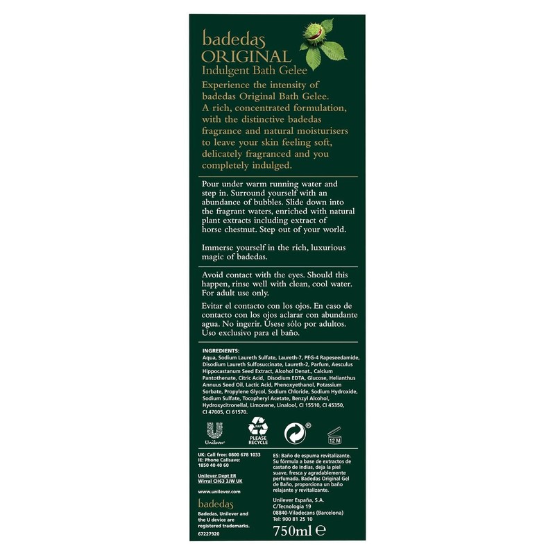 Product descriptionBadedas RichBubble Original Indulgent Bath Gelee with chestnut extract, 4 Pack of 750mlBadedas is a unique range of premium bath and shower products containing horse chestnut, that enriches Badedas with its distinctive fragrance. Badedas products are created with natural plant extracts for a truly luxurious bathing experience.A rich bath gel with a concentrated formulation, with the distinctive Badedas fragrance and natural moisturisers to leave your skin feeling soft, delicately fragranced, and leaves you feeling completely indulged.When using our Badedas Bath product for best results pour the bath gel under warm running water and step in then surround yourself with an abundance of bubbles. Slide down into the fragrant waters that is enriched with natural plant extracts including extract of horse chestnut. Step out of your world and immerse yourself with Badedas. When using Badedas bath gel avoid contact with the eyes and if this happens, rinse well with clean, cool water.Key Features: An indulgent Bath Gelee with extract of horse chestnut Contains natural moisturizers to leave your skin feeling soft A rich, concentrated formulation Enriched with natural plant extracts Made with the distinct Badedas fragranceInstructions: Pour under warm running water and step in. Surround yourself with an abundance of bubbles. Slide down into the fragrant waters, enriched with natural plant extracts including extract of horse chestnut. Step out of your worldCAUTION: If product gets in your eyes, rinse them with warm water. Avoid eyes and other sensitive areas. As we are always looking to improve our products, our formulations change from time to time, so please always check the product packaging before use.Box Contains: 12x Badedas Original Indulgent Bath GeleeDirectionsPour under warm running water and step in.Safety WarningMay cause eye irritation. Avoid contact with eyes and sensitive areas. For adult use only.