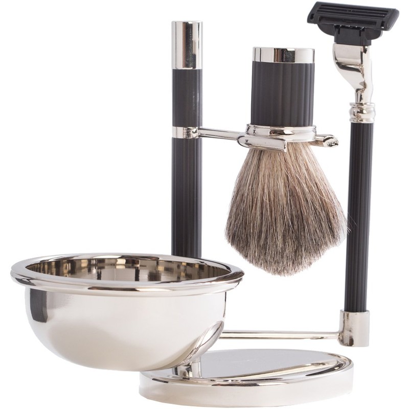 This four piece shaving set from Bey Berk includes a Mach 3 razor handle, badger brush, stand, and shave soap bowl.