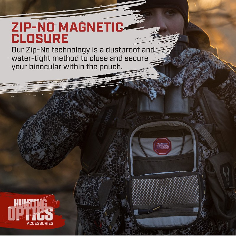 - Zip-No Magnet Closure - Zip-No technology is a dustproof and water-tight method to close and secure your binocular within the pouch – an easy one-handed operation