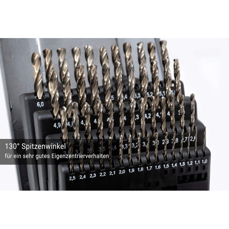 - Box contents: 51-piece HSSE extreme twist drill set, consisting of 1 piece from 1.0 mm to 6.0 mm (in 0.1 mm increments). Made of HSSE/Cobalt with cobalt alloy, specially developed for the machining of high-strength materials and stainless steels such as VA and INOX.