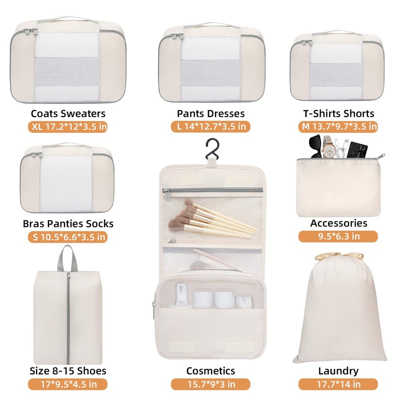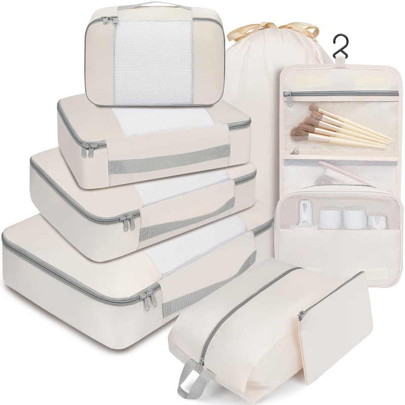BAGAIL 8 Set Packing Cubes Various Sizes Packing Organizer for Travel Accessories Luggage Carry On Suitcase-Beige